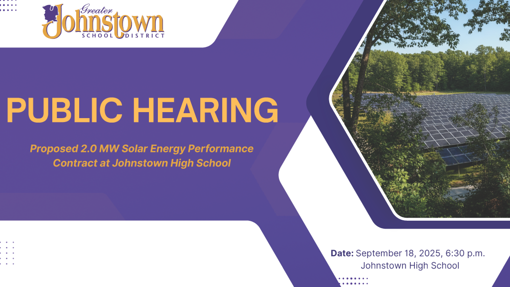 Approximately 25 community members attended the Greater Johnstown School District’s public hearing on on September 18 on its proposed Energy Performance Contract (EPC), which includes the installation of a revenue-generating solar project on District-owned land behind Johnstown High School. The event marked the first public gathering held in the newly renovated Large Group Instruction (LGI) space at the high school.